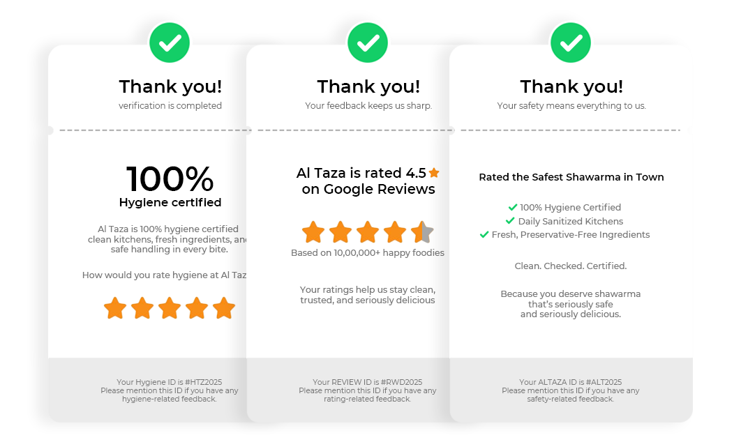 We are the only shawarma brand with a dedicated central kitchen, proudly recognized as the world’s best hygiene shawarma central kitchen by google. Every bite blends traditional Lebanese recipes with a modern flair. With our promise of freshness, hygiene, and flavor in every layer, Al Taza shawarma truly stands apart.